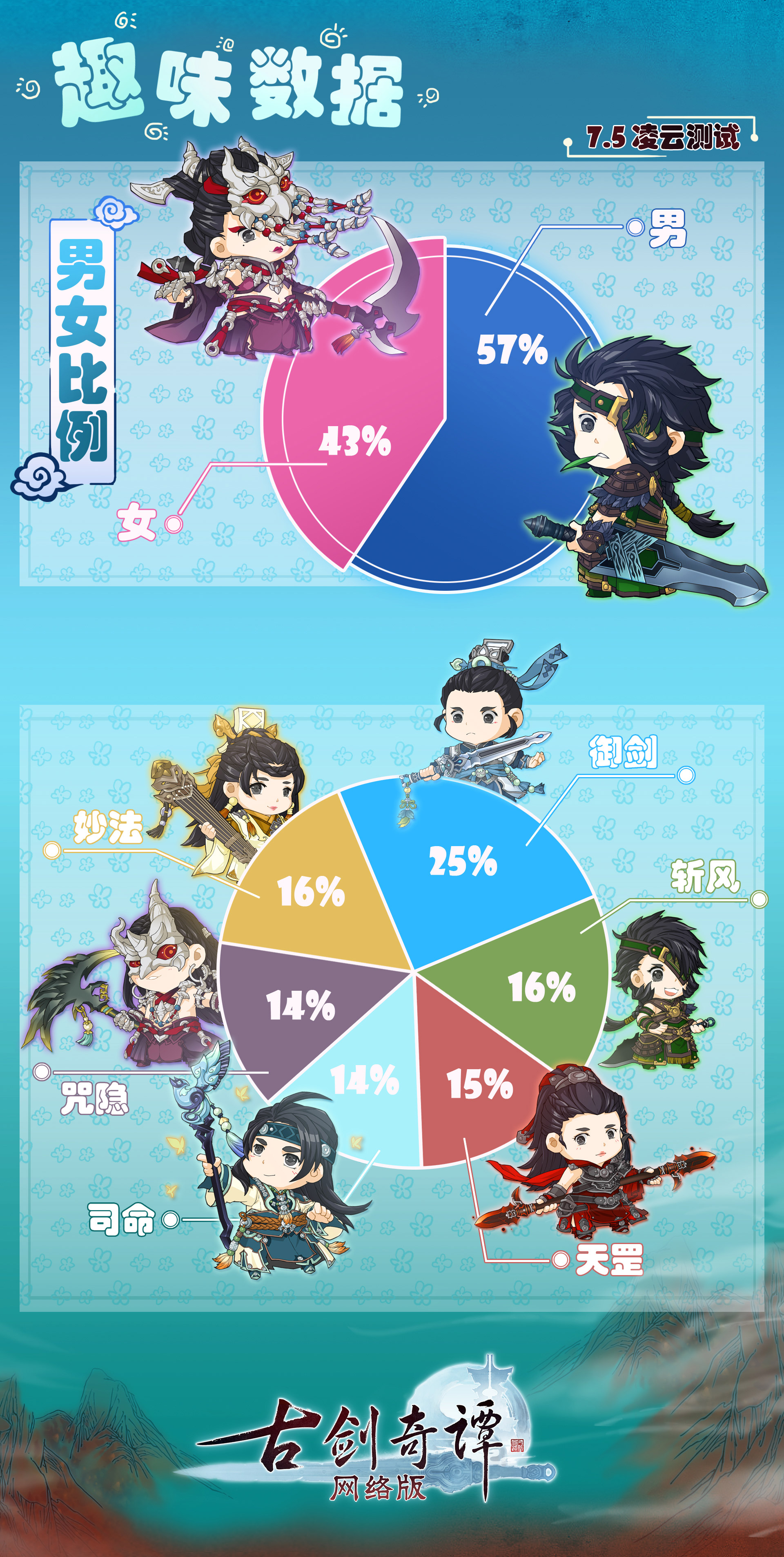 本次“凌云内测”,我们从以下方面统计了一些趣味数据:挖宝、男女玩家的比例、各职业创建比例、部分妖怪被击杀数,让我们从这些数字层面,感受下广大仙家弟子的修仙热情。
