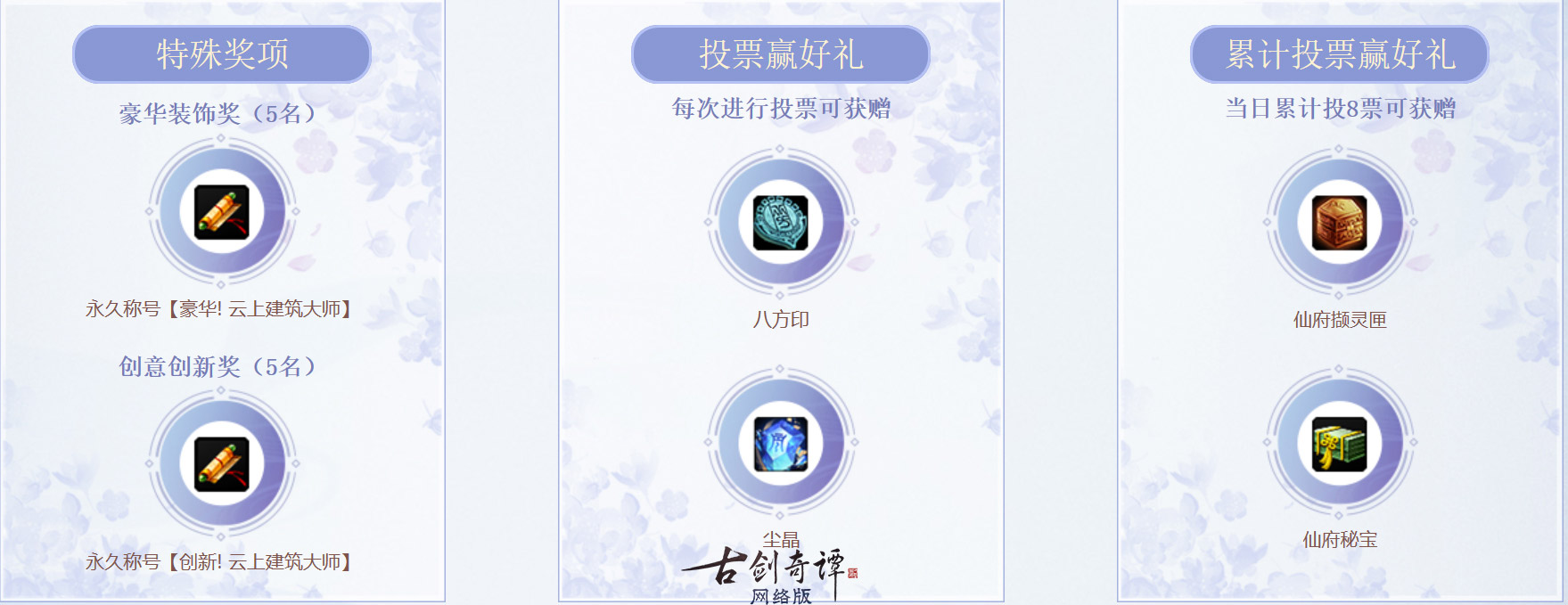 二、10月17日游戏更新后,服务器更新【云上建筑大师】榜单,各位仙家弟子可在界面右上角地图旁的“首届仙府设计竞赏会”处进行投票。禁止一切利用利益拉票行为,一经发现,将取消比赛资格。