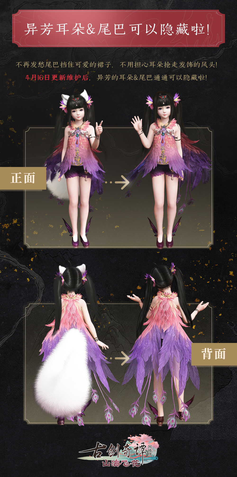 大家期盼已久的异芳门派狐耳和狐尾隐藏功能终于也要实现啦!4月16与商城上新同步更新,各位仙家弟子可以根据自己的偏好在着装界面选择性隐藏,搭配从此有了更多样的选择!