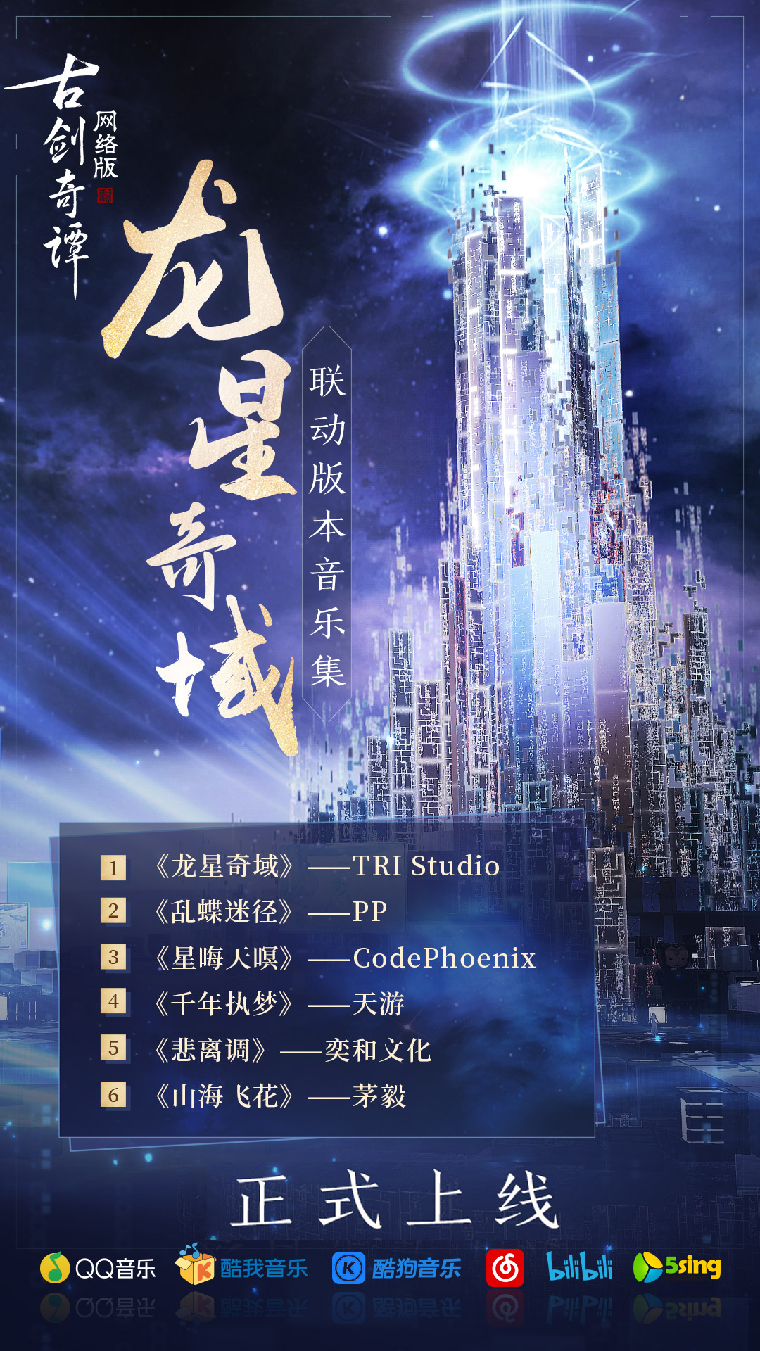 收录了“梦与时空”和“山海飞花”两个联动版本的原创音乐集《龙星奇域》,即将在QQ音乐、酷我音乐、酷狗音乐、网易云音乐、bilibili和5sing原创音乐基地六大平台上线!