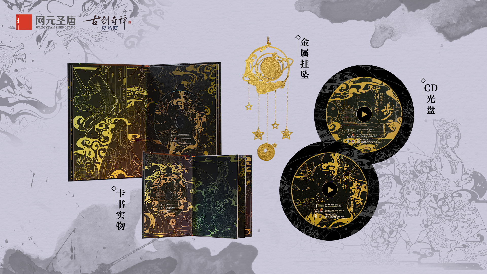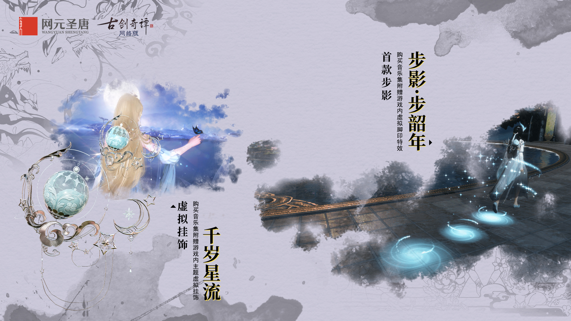 实体音乐集除包含三十余首曲目的原声音乐CD、精美音乐集包装卡书、实体铜刻金属挂饰以外,还包含游戏虚拟——道具音乐集主题永久挂饰“千岁星流”以及音乐集主题首款永久步影特效“步韶年”!
