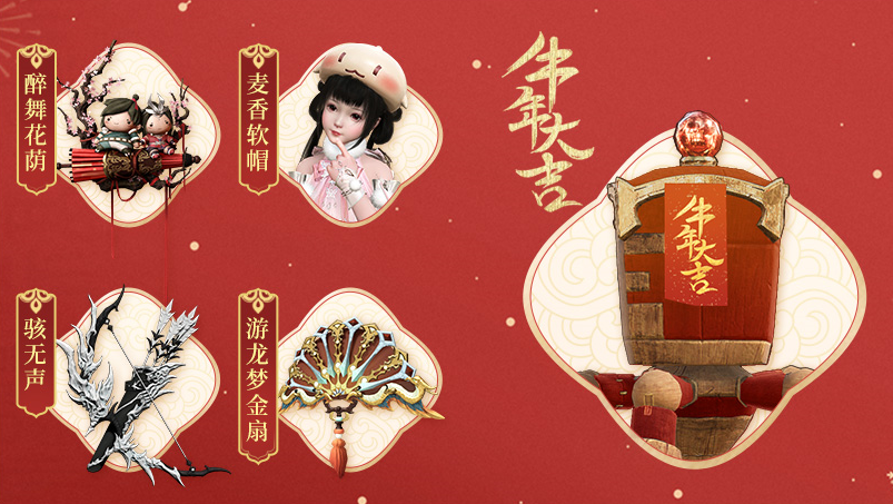 自2月25日开启后至3月11日更新维护前,活动期间,累计签到3天可从【游龙梦金扇】、【麦香软帽】、【骸无声】、【醉舞花荫】、【188尘晶】中任选其一作为奖励,累计签到7天即可领取春节特供版【坐骑·吉祥力士】,同时,还有【秘文残片·叁柒伍】、【十州令·无限】、镶嵌等奖励可供领取。