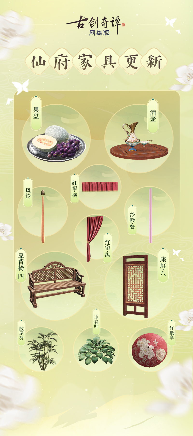 配方新增:散尾葵、玉春叶、果盘、红帘·纵、红帘·横、风铃、纱幔·紫、红纸伞、靠背椅·四、座屏·八、酒壶。