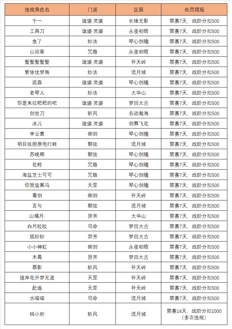 针对本次核实到的违规者,将进行【铭锋论剑】禁赛,扣除战阶分数(如有战旅将同时扣除战旅分数),回收对应段位奖励等处罚,具体处理名单如下: