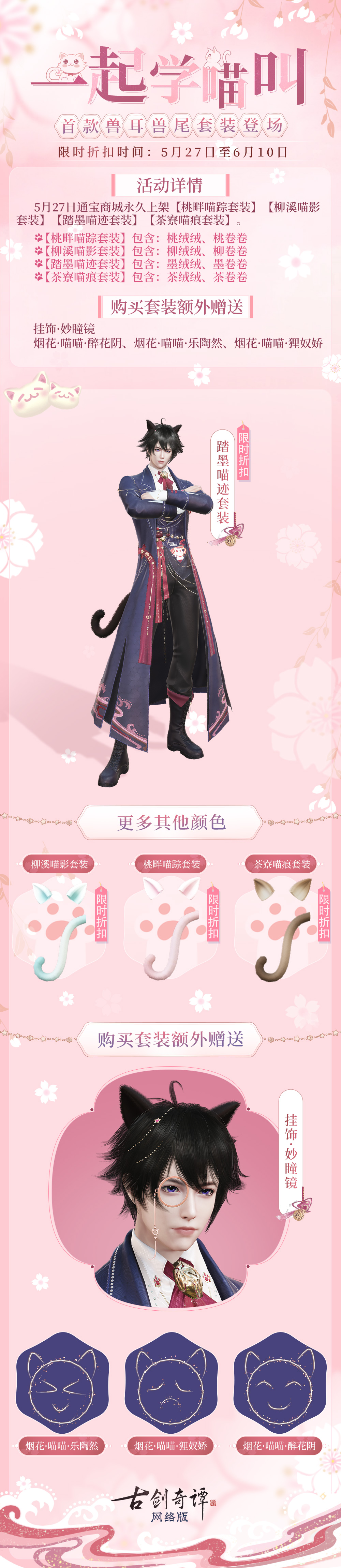 通宝商城永久上架【桃畔喵踪套装】【柳溪喵影套装】【踏墨喵迹套装】【茶寮喵痕套装】,内含猫耳猫尾挂饰,购买套装额外赠送单片镜挂饰·妙瞳镜、三款喵喵烟花。