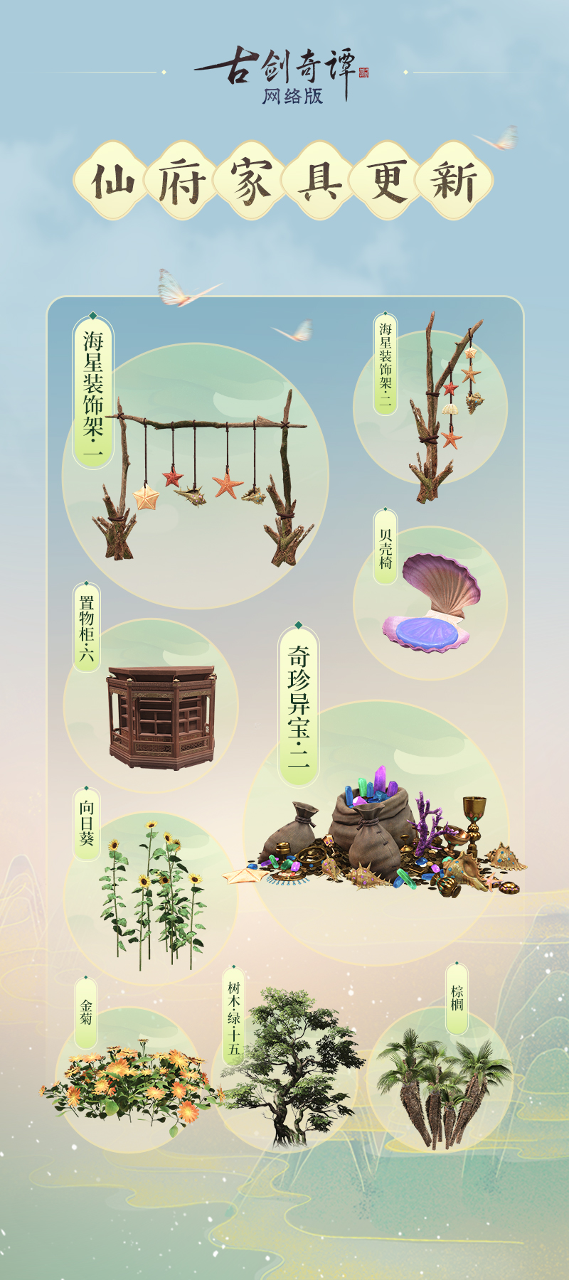 金菊、置物柜·六、棕榈、海星装饰架·一、海星装饰架·二、贝壳椅、奇珍异宝·二、树木·绿·十五、向日葵。