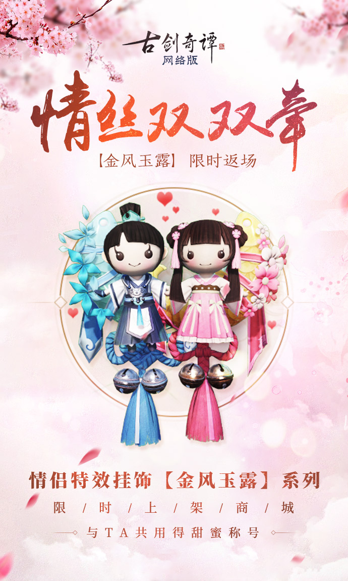 七夕专属挂饰【金风玉露·姣姣】【金风玉露·迢迢】限时返场通宝商城,好友或师徒分别佩戴,靠近时可激活专属特效并获得称号【情丝双双牵】。