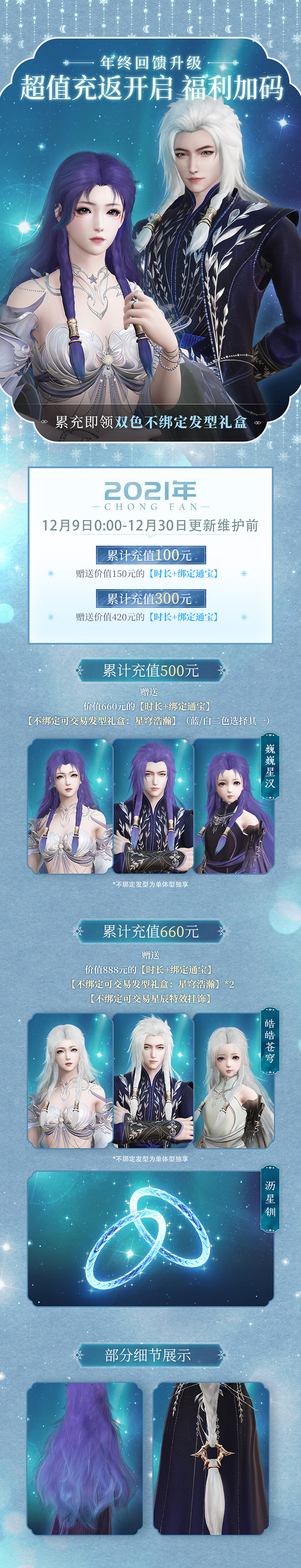 累计充值达500元,每月送3000分钟游戏时长、800绑定通宝,持续赠送6个月,价值660元,并加送(不绑定可交易)【礼盒·星穹浩瀚】;
