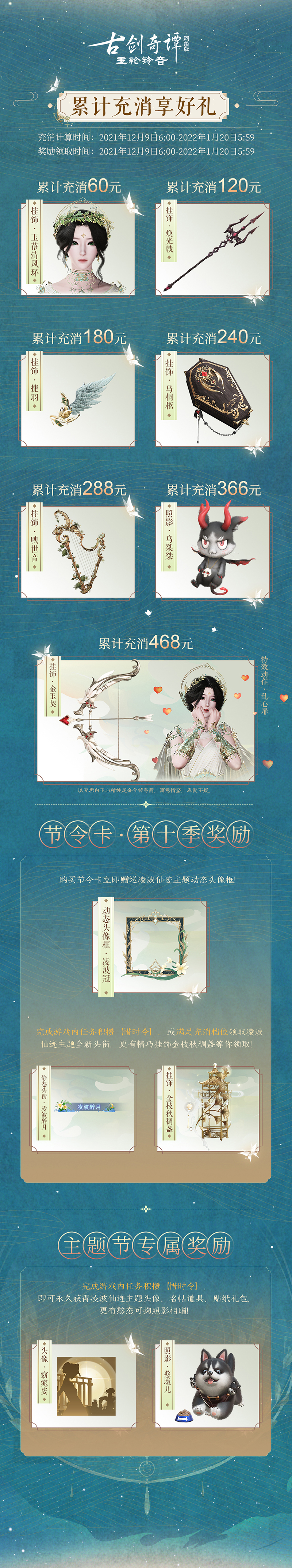本季节令卡持续时间至2022年1月20日5时59分59秒,届时活动期间获得充消、惜时令数额将在下一季活动重新计算,同时需要获得新一季节令卡方可继续参与活动。