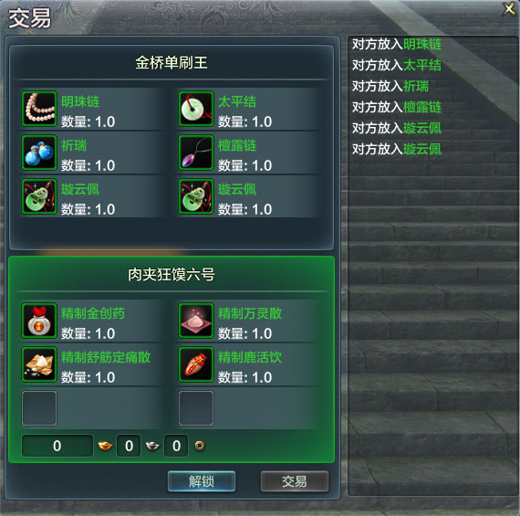 交易双方放入要交易的物品和金钱后,均点击锁定及确定后交易才可成功。
