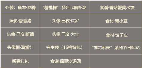 拜年红包,开启有几率获得:压祟钱、年画系列藏品、节日烟花、点星坠夜、密藏·年年有余等奖励。